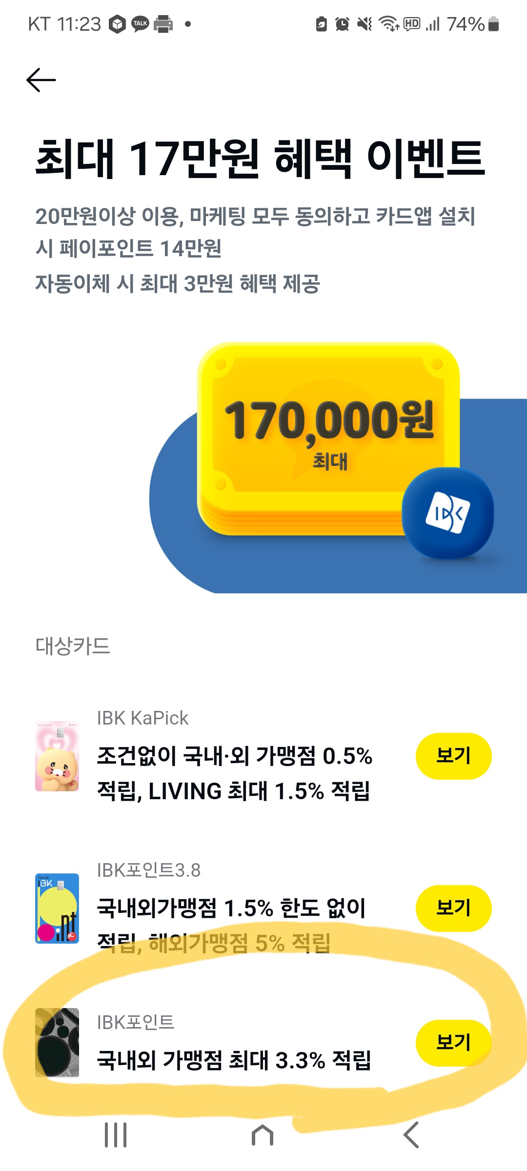 카카오페이에서 25년 4월까지 <IBK 포인트 신용카드>의 신규가입 이벤트를 진행하고 있습니다. 카드를 신청할 때 마케팅 관련 체크사항에 모두 동의하고, 카드앱을 설치하고, 20만 원 이상 이용하면 14만 원의 페이포인트를 지급하고 있습니다. 또 자동이체를 이용할 때는 최대 3만 원의 혜택을 준다고 합니다. 저는 자동이체는 귀찮아서 말았는데, 꼼꼼히 살펴보시고 자동이체까지 할 수도 있겠지요 ^^
