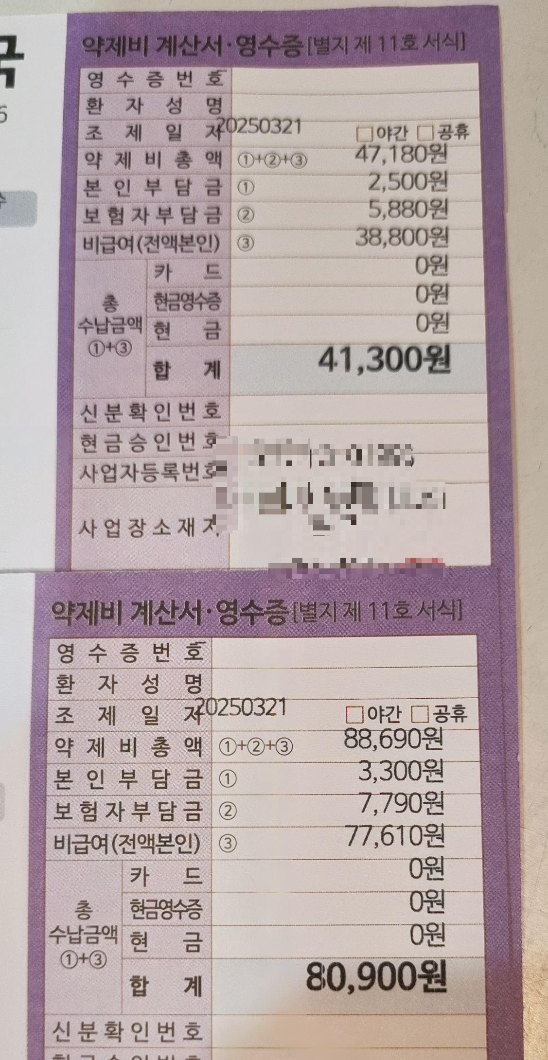 헬리코박터 제균 약은 가격이 비쌉니다. 그리고 대부분의 경우에 보험적용이 모두 되지는 않아서 환자분이 내시는 금액이 큽니다. 아래 사진은 저희 약국에서 1차 약을 7일분, 14일분 받으실 경우 영수증입니다. 100/100(헬리코박터약은 대부분 보험이 100/100으로 처방됩니다.)으로 처방받을 경우 1차약 7일분은 41,300원, 14일분은 80,900원입니다.